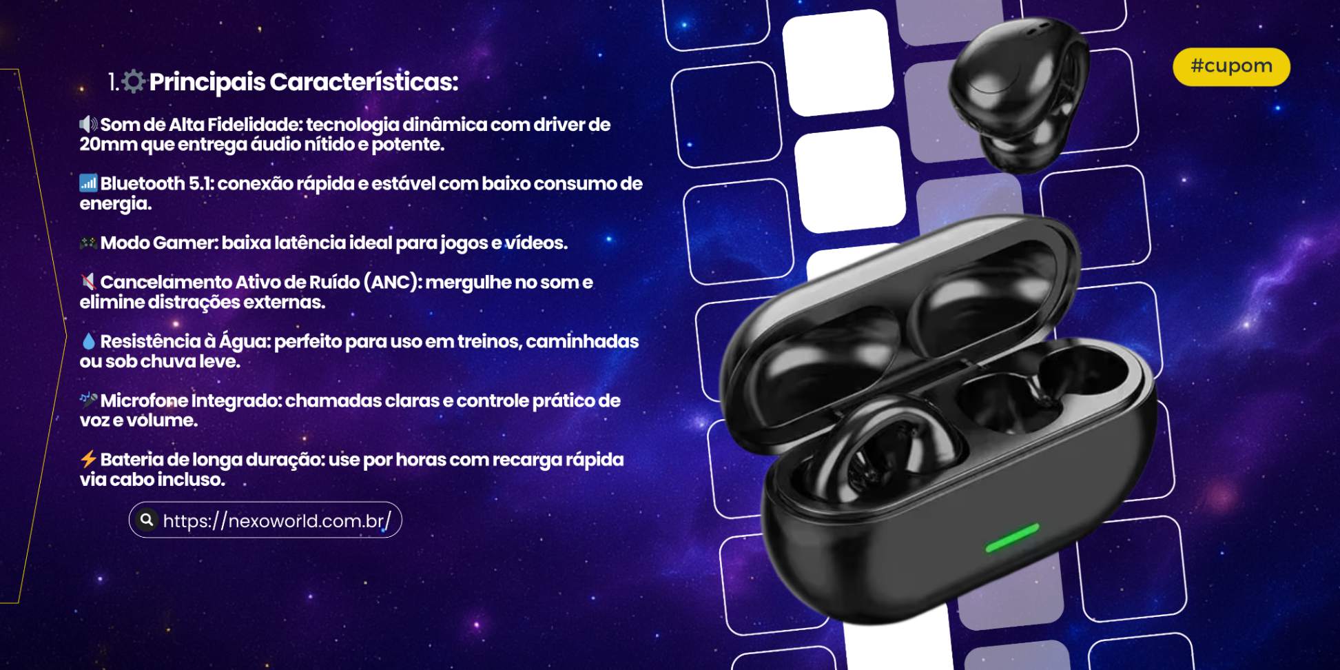 🔊 Som de Alta Fidelidade: tecnologia dinâmica com driver de 20mm que entrega áudio nítido e potente.